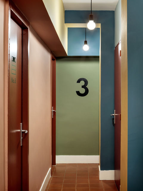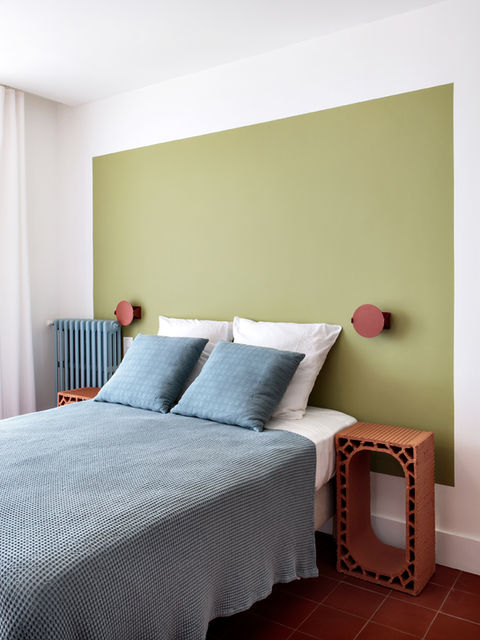 The nine rooms, disposed onto three levels, have a private balcony with a privileged view onto the Arenas. The architect Eloise Bosredon renovated in 2019 this building from the 50's, choosing to keep its geometric structure. The old fashioned look was revisited with a brand new decoration: round shape furniture, warm and lively colors, graphic patterns.